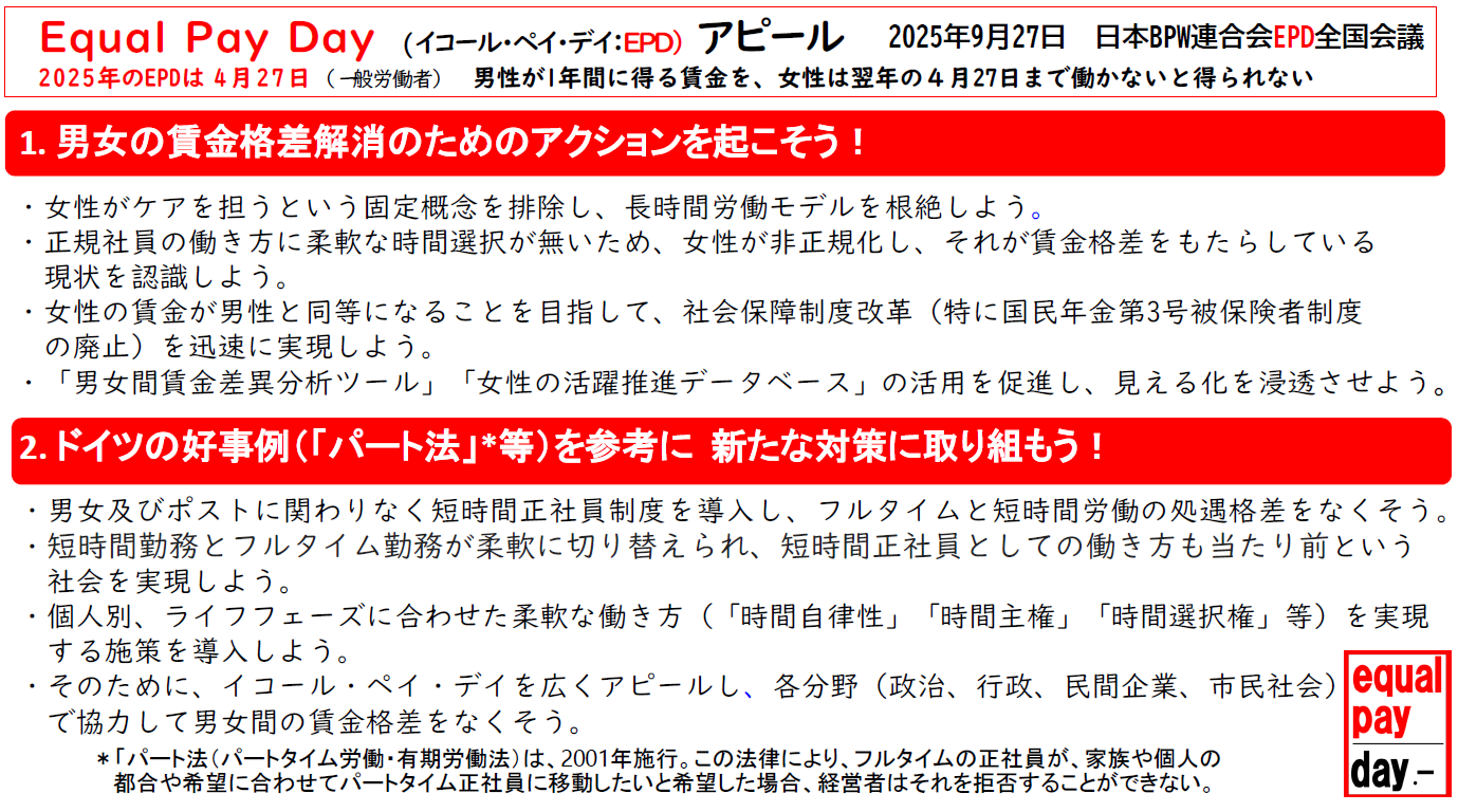 日本BPW連合会は、2025年9月27日の「EPD全国会議にて「2025年イコール・ペイ・デイ・アピール」を採択しました。上記画像をクリックするとPDFでご覧いただけます。