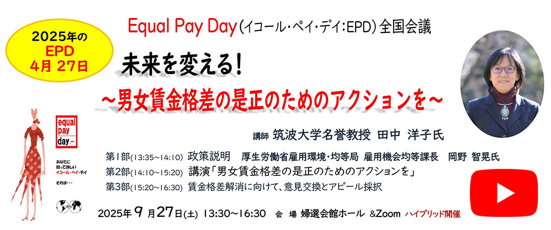 2025年9月27日「日本BPW連合会・EPD全国会議」で行われた筑波大学名誉教授・田中陽子氏の講演「未来を変える!~男女賃金格差の是正のためのアクションを~」の動画をYouTubeにて配信しています。上記タイトル画像をクリックしてご覧ください。